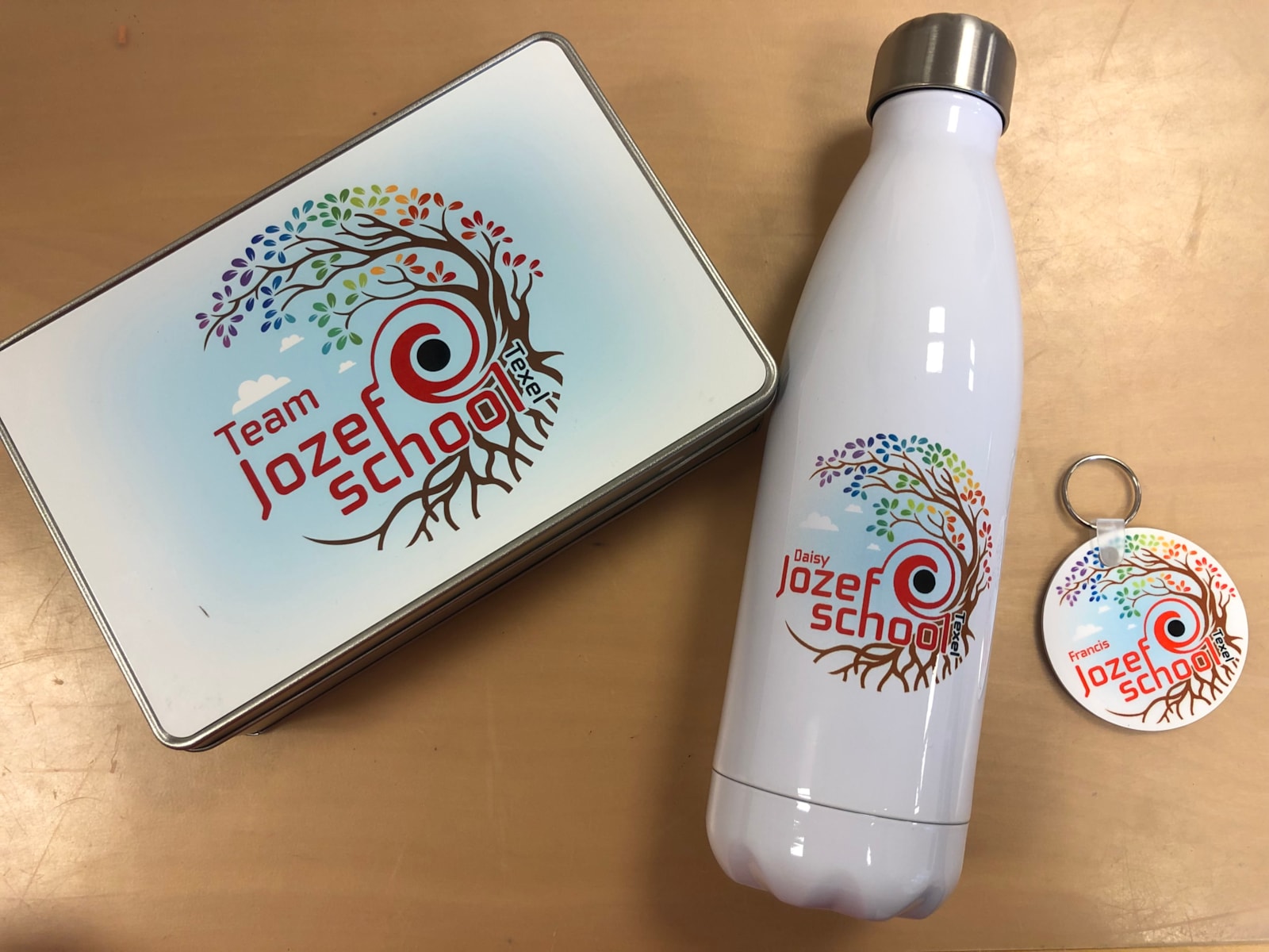 De collega’s hebben een mooie thermosfles en sleutelhanger ontvangen.
